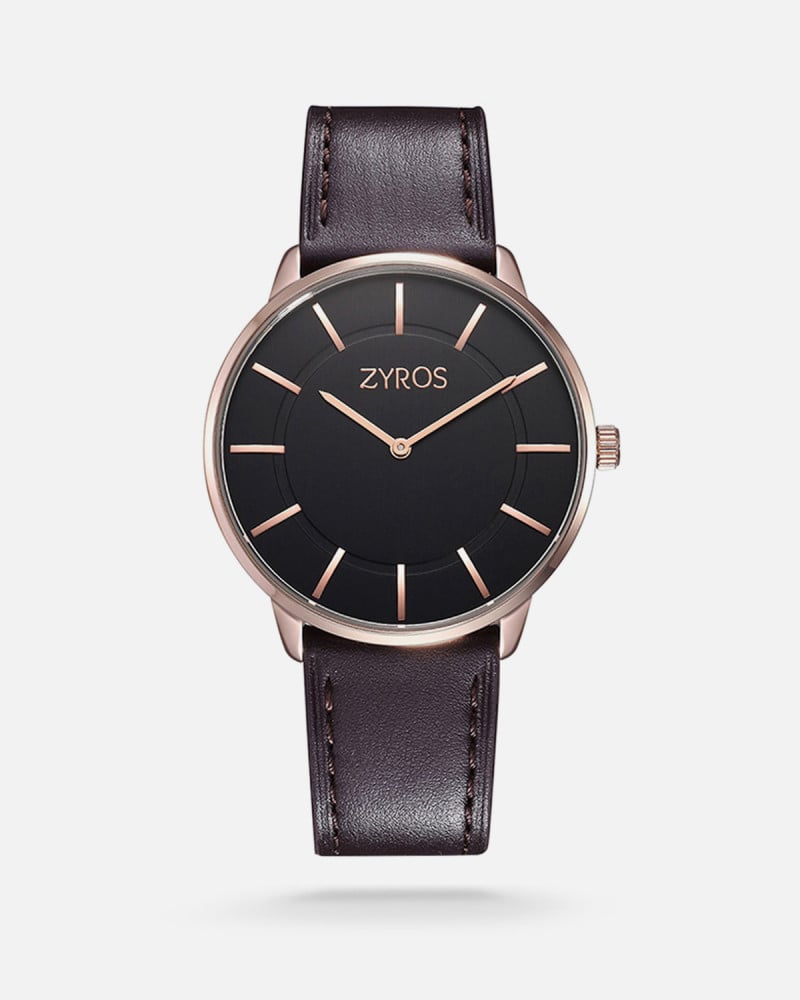 ساعه رجاليه من ماركة زايروس بسوار من الجلد باللون البني ، تجمع الساعة بين الطابع الكلاسيكي العملي والعصري الأنيق ، تتميز الساعه بالميناء باللون الأسود وبحدود باللون الروز قولد الذي يضيف للساعة المزيد من التفرد ، هذه الساعة خيارك الأمثل لأضافه لمسه جذابه على إطلالتك في العمل او المناسبات ، هذه الساعة صممت لأصحاب الذوق الرفيع